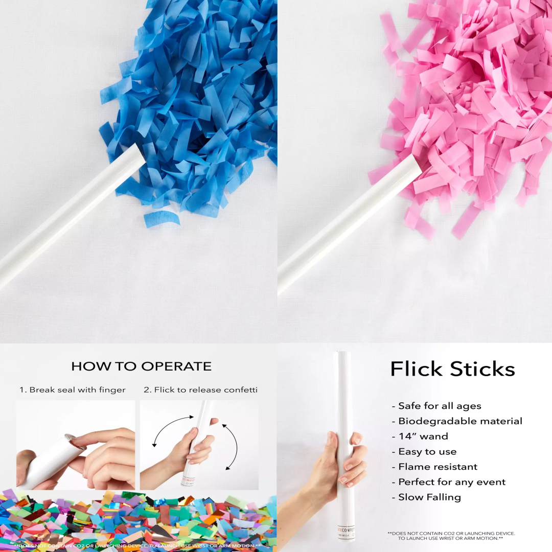 - Gender Reveal Flick Sticks (Marked with sticker that we can remove for you)Flick Stick Pics (click to see pic) - $10 Each - 3 for $25 - 8 for $60