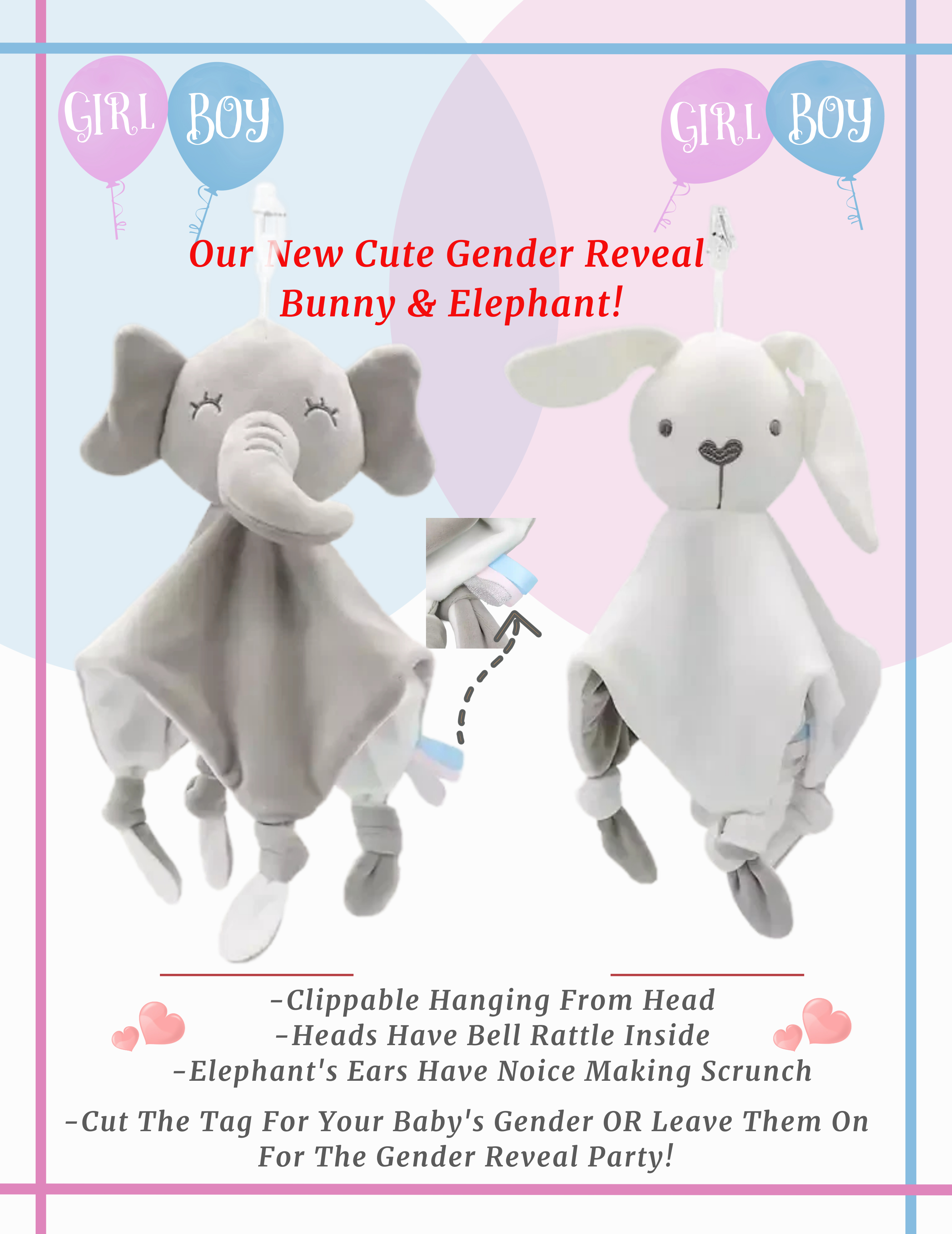 - One Of Our Super Soft & Cuddly 12" Gender Reveal Baby Elephant or Bunny. Has cut-away Gender Tag, Knots That Babies Love, Scrunch Ears, and Rattle Inside. So Cute! Bunny & Elephant (click to see pic)