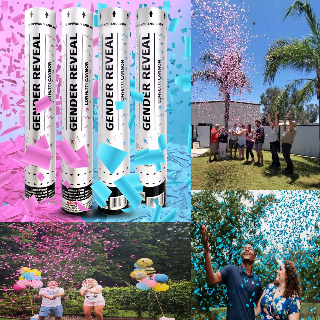 - 2 Gender Reveal Cannons (Marked with code so you don't know color inside)Confetti Cannons In Action (click to see pic) - Add Extras for everyone to join in! $10 each with this package ONLY ($20 value)